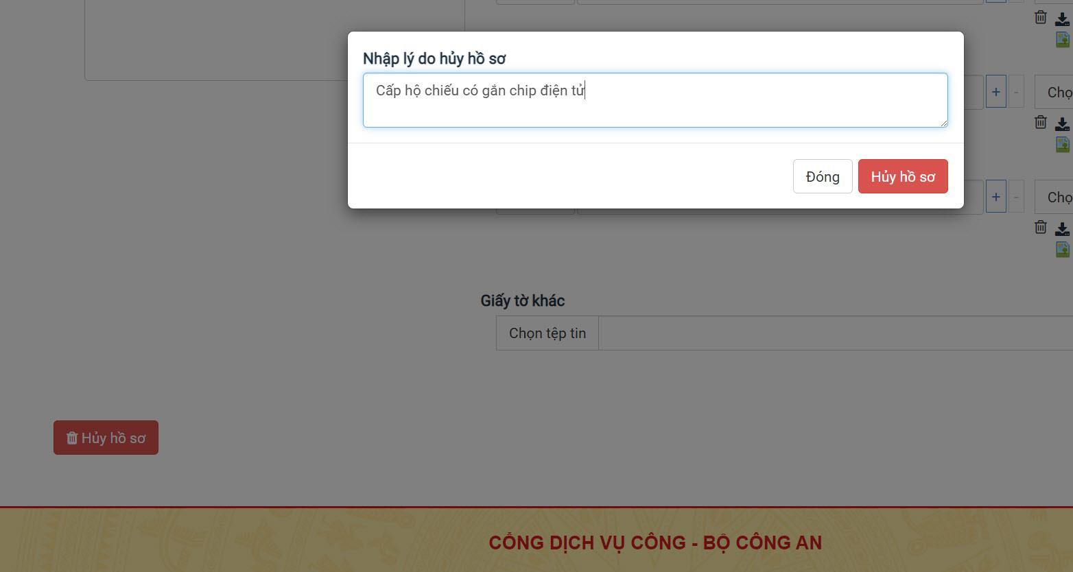 Kéo xuống dưới chọn Huỷ hồ sơ và nhập lý do huỷ.