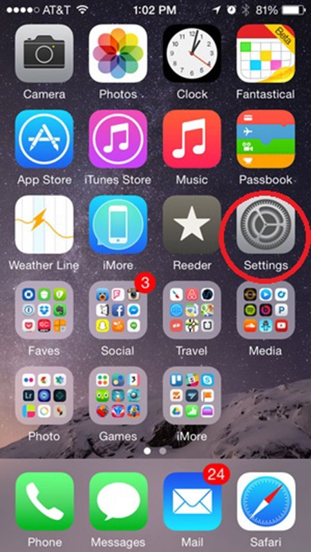 Ngoài màn hình chính iPhone, hãy vào Settings (khoanh đỏ). |