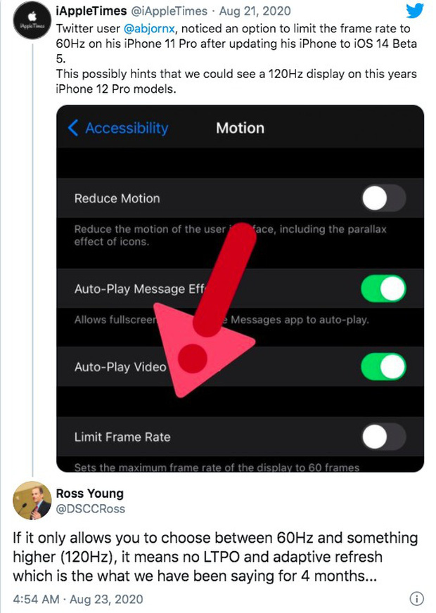 Một người dùng Twitter đã thấy một tùy chọn để giới hạn tốc độ khung hình ở mức 60Hz sau khi nâng cấp iPhone 11 Pro của họ lên hệ điều hành iOS 14 Beta 5. Điều này gián tiếp khẳng định Apple gần như sẽ trang bị màn hình 120Hz Promotion mới.
