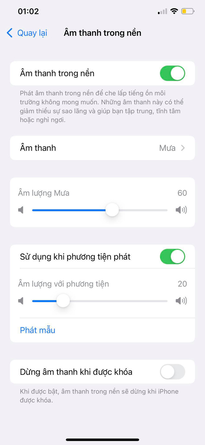 Đặc biệt, trên iOS 15 nhiều người dùng còn phát hiện ra tính năng nghe nhạc cực "chill" với âm thanh nền như tiếng mưa, tiếng đại dương, tiếng suối... Với tính năng mới này, khi bạn chọn các bài nhạc để phát sẽ có thêm tiếng nền giúp "chill" hơn và không ảnh hưởng đến các bài nhạc.