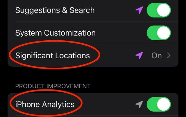 Tại đây sẽ có tùy chỉnh Significant Locations - tính năng giúp theo dõi những vị trí người dùng thường xuyên đến và sử dụng dữ liệu địa điểm cho nhiệm vụ khác nhau, ví dụ dự đoán tình trạng giao thông của lộ trình di chuyển. Tính năng này được mã hóa đầu cuối nên bất kỳ dữ liệu gì thu thập được chỉ lưu giữ trên iPhone.