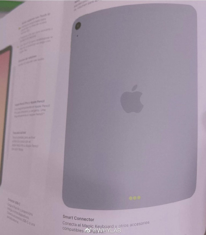 Ở mặt lưng, iPad Air mới cũng sẽ chỉ được trang bị camera đơn duy nhất ở góc trái. Ngoài ra phía dưới cùng của mặt lưng này cũng xuất hiện cổng Smart Connector dùng để kết nối tới bàn phím Magic Keyboard mới của Apple. Dự kiến iPad Air 4 mới sẽ được Apple giới thiệu vào khoảng đầu năm sau.