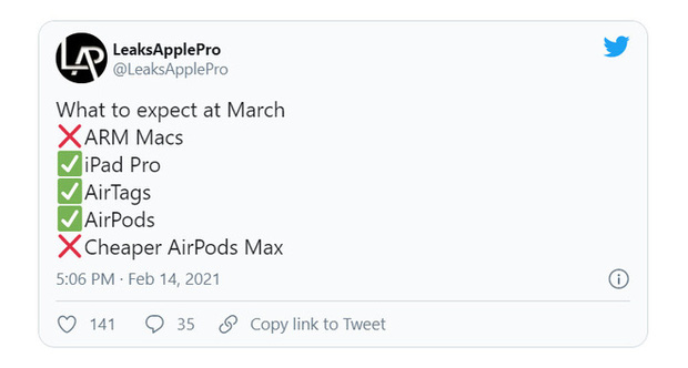 Hiện tại vẫn chưa rõ thực hư các sản phẩm Apple sẽ tình làng tại sự kiện vào tháng 3 tới nhưng ít nhất có một thiết bị chắc chắn sẽ ra mắt tại sự kiện này. Đó là AirTags.