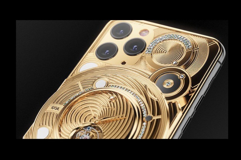 Tất nhiên, ‘tiền nào của nấy’, mặt lưng của iPhone 11 Pro Discovery Solarius được chế tác từ nửa kg vàng và 137 viên kim cương. Chưa kết, phần mặt lưng của máy được trang trí với đồng hồ cơ trang bị cơ chế Tourbillon, bộ phận chuyển động dạng lốc xoáy chỉ có trên đồng hồ hạng sang. Đặc biệt hơn nữa, ngay trên mặt đồng hồ là viên đá mặt trời - loại kim cương vàng quý hiếm.