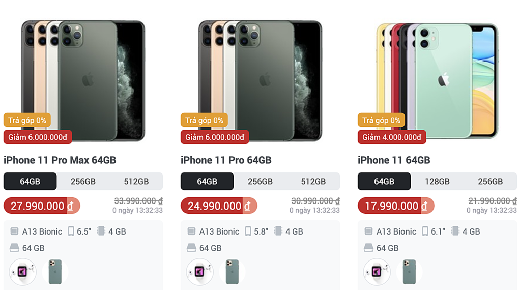 iPhone 12 cận kề ngày ra mắt và tin đồn iPhone 11 Pro và 11 Pro Max sớm bị khai tử khiến giá bộ đôi này giảm sâu tại Hà Nội và TP HCM. Tại một số hệ thống lớn, iPhone 11 Pro Max 64 GB hạ từ 34 triệu xuống 28 triệu đồng. Bản iPhone 11 Pro từ 31 triệu xuống 25 triệu đồng. Tại các hệ thống nhỏ, giá iPhone 11 Pro và 11 Pro Max bản chính hãng (mã VN/A) giảm sâu hơn. Bản 64 GB còn lần lượt 24,4 và 26,5 triệu đồng.