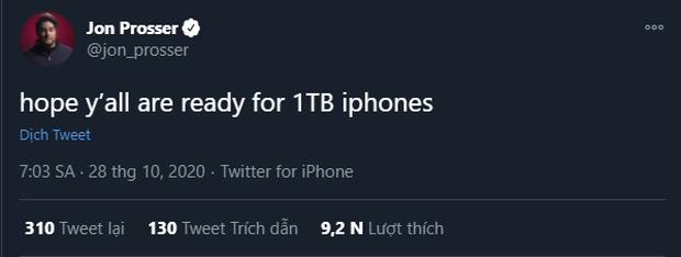 Cách đây không lâu, leaker có tên là Jon Prosser, người hiếm khi mắc lỗi khi nói đến các thiết bị của Apple, cho biết dòng sản phẩm iPhone 13 sẽ có dung lượng 1TB. Tuy nhiên, thông tin về mẫu điện thoại có bộ nhớ trong "khủng" chỉ có từ phiên bản Pro trở lên.