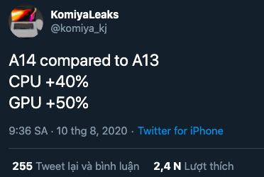 Komiya Leaks, tài khoản Twitter gần đây đưa ra một số dự đoán chính xác về các thiết bị chưa ra mắt của Apple, tiết lộ chip Apple A14 Bionic có CPU nhanh hơn tới 40%, khả năng đồ họa GPU nhanh hơn 50% so với A13 Bionic.