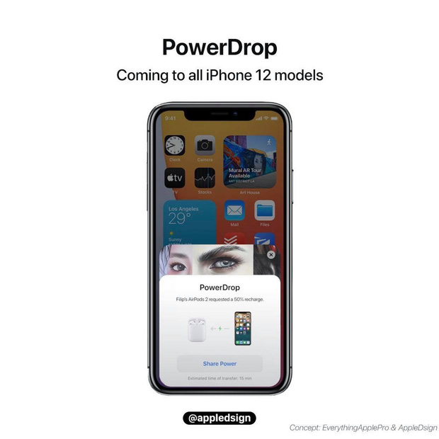 Theo như hình ảnh concept thì iPhone 12 Series có thể chia sẻ pin cho các thiết bị có hỗ trợ tính năng sạc không dây thông qua AirDrop.