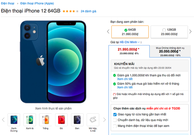 Khoảng đầu tháng 4 vừa rồi, các đại lý bán lẻ của Apple đang bán mẫu iPhone 12 64GB với giá 21 triệu đồng - 22 triệu đồng, thậm chí nhiều cửa hàng còn bán tới 23 triệu đồng đối với các màu hiếm, khan hàng như xanh mint.