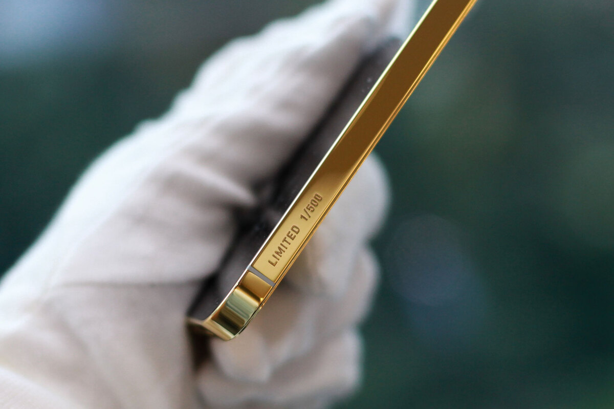 Khung viền vàng làm mặt trước của máy trông nổi bật hơn. Theo đại diện đơn vị chế tác, những chiếc iPhone mạ vàng có thể bị mòn ở các góc cạnh sau một thời gian sử dụng do chất liệu vàng dễ bị ăn mòn.