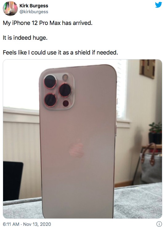Không ngạc nhiên khi chiếc iPhone cao cấp nhất là iPhone 12 Pro Max vẫn chiếm được sự quan tâm đông đảo nhất. Ấn tượng đầu tiên của đa số người dùng về chiếc máy này là nó thật sự rất lớn. "Tôi cảm thấy tôi có thể dùng nó như một chiếc khiên chắn nếu muốn.", người dùng Kirk Burgess đến từ New Zealand viết trên Twitter.
