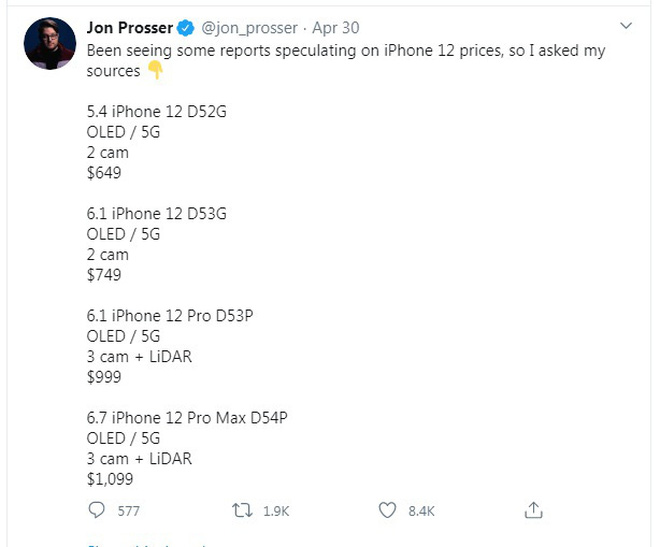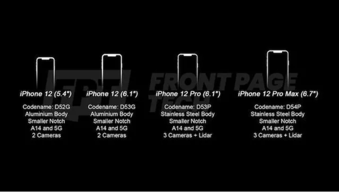 Youtuber Jon Prosser của Front Page Tech vừa dự đoán, chiếc iPhone 12 sẽ có 4 phiên bản khác nhau, gồm 2 bản tiêu chuẩn và 2 bản cao cấp. Bộ đôi iPhone 12 tiêu chuẩn sẽ có kích thước màn hình 5,4 inch và 6,1 inch. Với phiên bản iPhone 12 cao cấp sẽ có kích thước màn hình 6,1 inch và 6,7 inch.