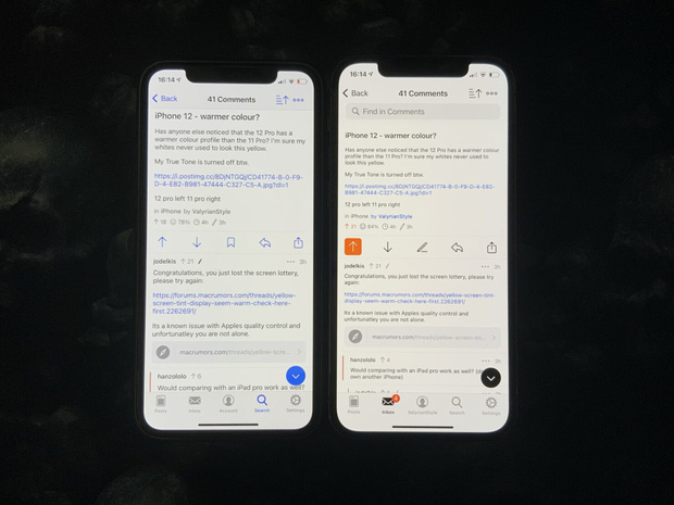 Rất nhiều người dùng iPhone 12 và 12 Pro đã than phiền về màn hình trên chiếc smartphone của họ có màu sắc "ấm" hơn so với các sản phẩm iPhone 11 năm ngoái. Tài khoản u/ValyrianStyle trên Reddit cho biết đã tắt tính năng True Tone nhưng vấn đề này vẫn không được cải thiện. Anh đã đặt chiếc iPhone 12 Pro của mình cạnh một chiếc iPhone 11 Pro để có thể thấy rõ sự khác biệt.