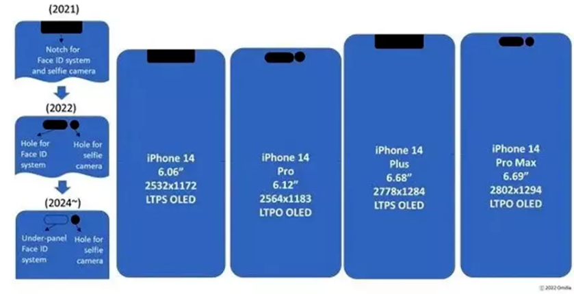 Omdia cũng cho biết một vài thông số màn hình của dòng iPhone 14. Theo đó, iPhone 14 và iPhone 14 Max sẽ sử dụng tấm nền LTPS OLED với tốc độ làm tươi cao hơn thế hệ trước, nhưng vẫn giữ nguyên thiết kế "tai thỏ" như với iPhone 13.