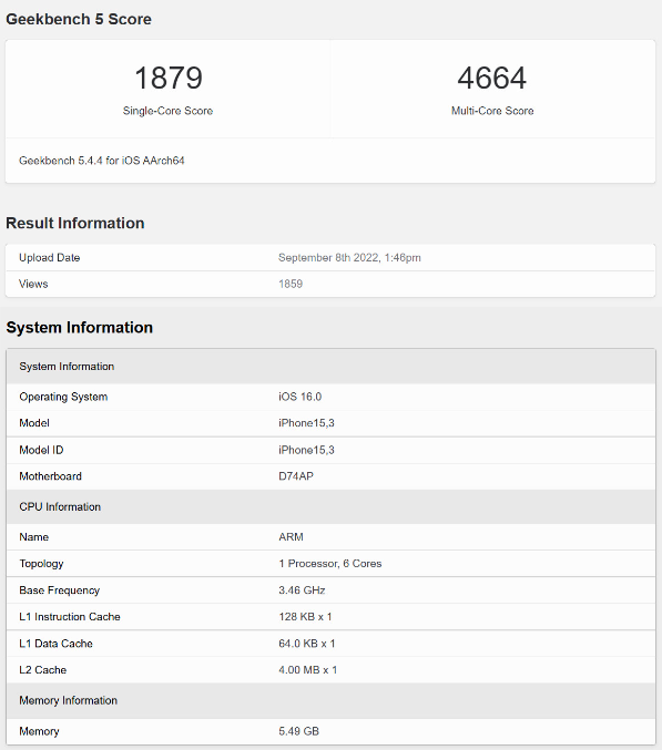 Theo Macrumors, kết quả kiểm tra Geekbench cho iPhone15,3, mã định danh cho iPhone 14 Pro, cho thấy iPhone mới có điểm đơn lõi là 1.879 và điểm đa lõi là 4.664.