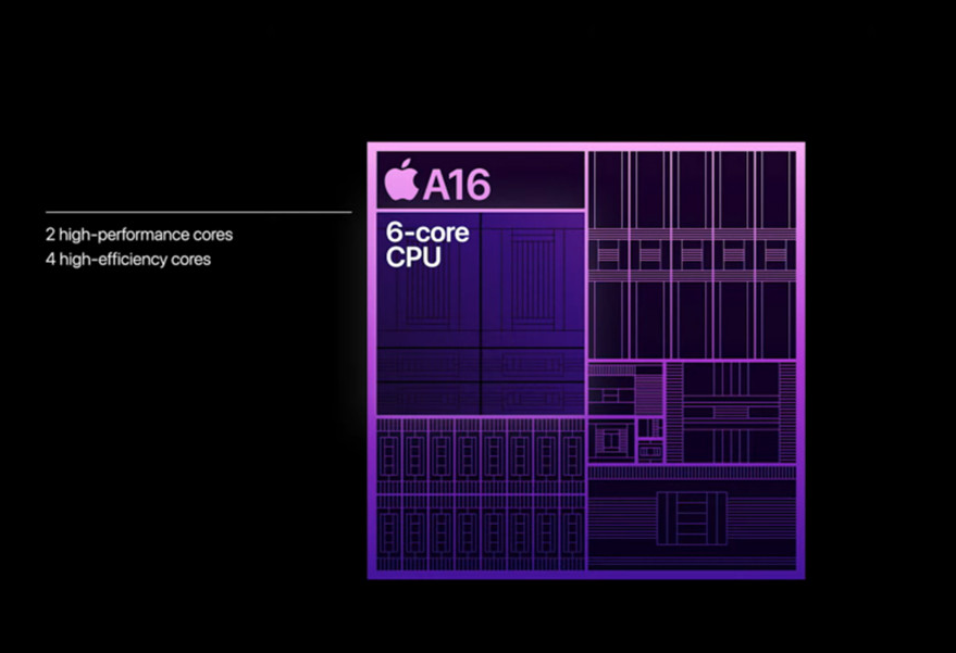 Đối với CPU, A16 Bionic có 6 nhân như A15 Bionic, nhưng Apple cho biết đó là "CPU 6 nhân mới" bao gồm 2 nhân hiệu suất cao và 4 nhân tiết kiệm năng lượng.