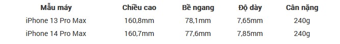 Về kích thước, iPhone 14 Pro Max nhỏ gọn hơn iPhone 13 Pro Max một chút về chiều cao và bề ngang, nhưng dày máy hơn. Những sự khác biệt nhỏ này có thể không dễ nhận ra trừ khi đặt 2 máy cạnh nhau.