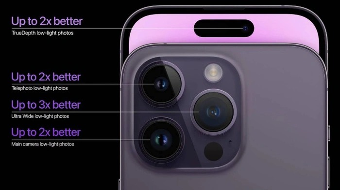 Theo Apple, camera trên iPhone 14 Pro cải thiện khả năng chụp thiếu sáng 2 lần so với thế hệ tiền nhiệm, cho phép thu ánh sáng nhiều hơn tới 4 lần, chụp ProRAW ở 48MP.