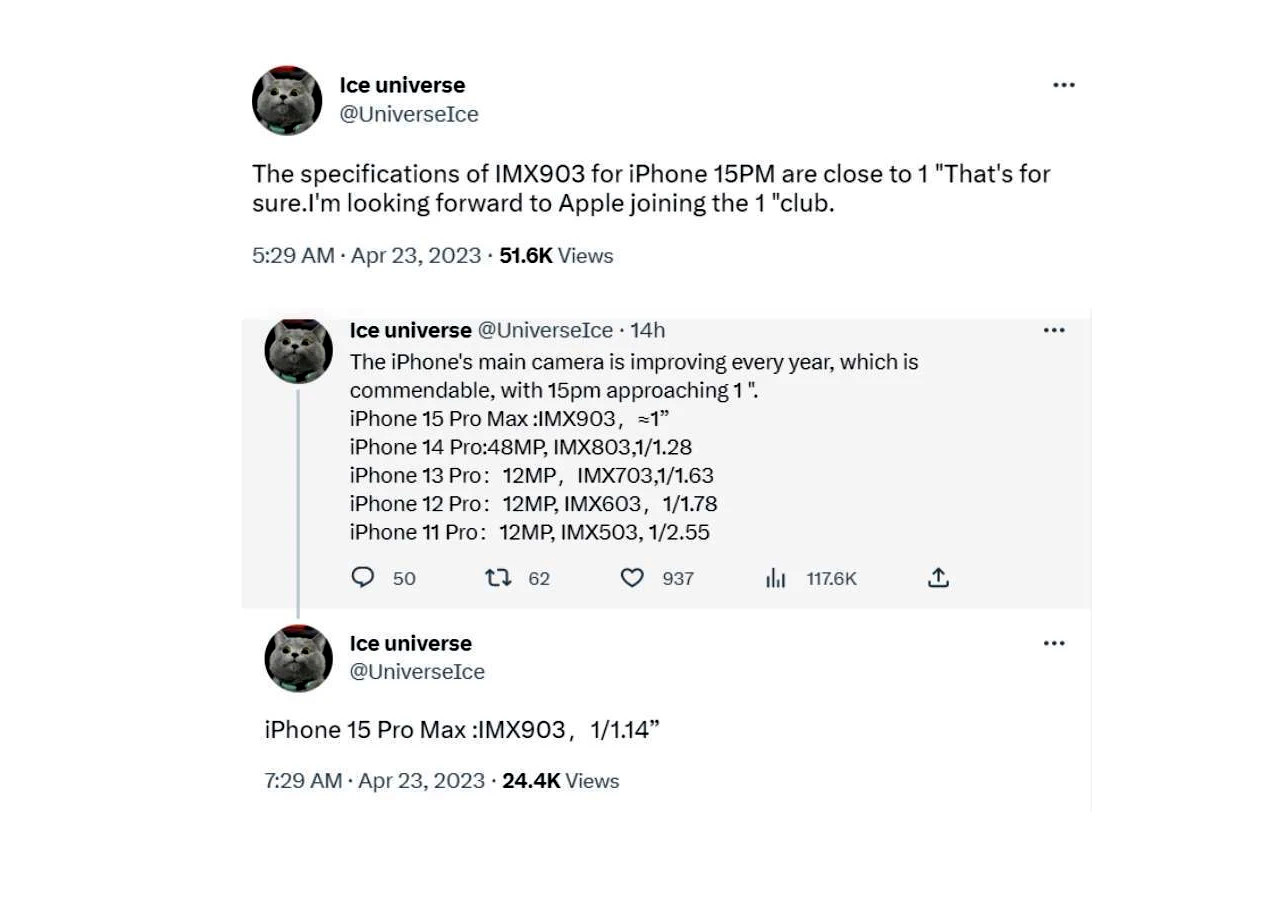 Theo PhoneArena, nguồn tin đáng tin cậy Ice Universe tiết lộ rằng iPhone 15 Pro Max hoặc iPhone 15 Ultra sẽ sử dụng cảm biến mới của Sony cho camera chính. IPhone 14 Pro Max được trang bị cảm biến Sony IMX803 48MP trong khi iPhone 15 Ultra sẽ có cảm biến Sony IMX903.