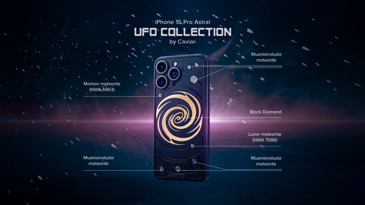 Trong dịp Halloween năm nay, Caviar sẽ giới thiệu bộ sưu tập UFO cho iPhone 15 Pro và iPhone 15 Pro Max sang trọng. Các "siêu phẩm" này được đặt làm riêng, kết hợp sử dụng các vật liệu từ ngoài vũ trụ, chính xác hơn là những mảnh vỡ từ thiên thạch Murchison có chứa axit amin (thành phần tạo nên sự sống trong vũ trụ).