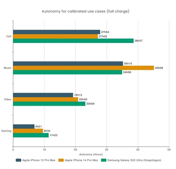 Theo đó, khi chơi game cấu hình cao thì iPhone 15 Pro Max cạn pin nhanh chóng chỉ sau 6 giờ 51 phút. Con số này trên iPhone 14 Pro Max là 9 giờ 34 phút và Samsung Galaxy S23 Ultra là 11 giờ 23 phút. Với tác vụ xem video cũng tương tự khi iPhone 15 Pro Max có thời gian kém nhất với 19 giờ 13 phút khi sạc đầy. Trong khi đó, iPhone 14 Pro Max và S23 Ultra lần lượt là 20 giờ 49 phút và 23 giờ 09 phút.