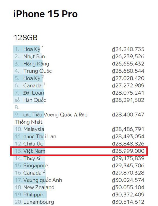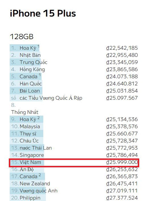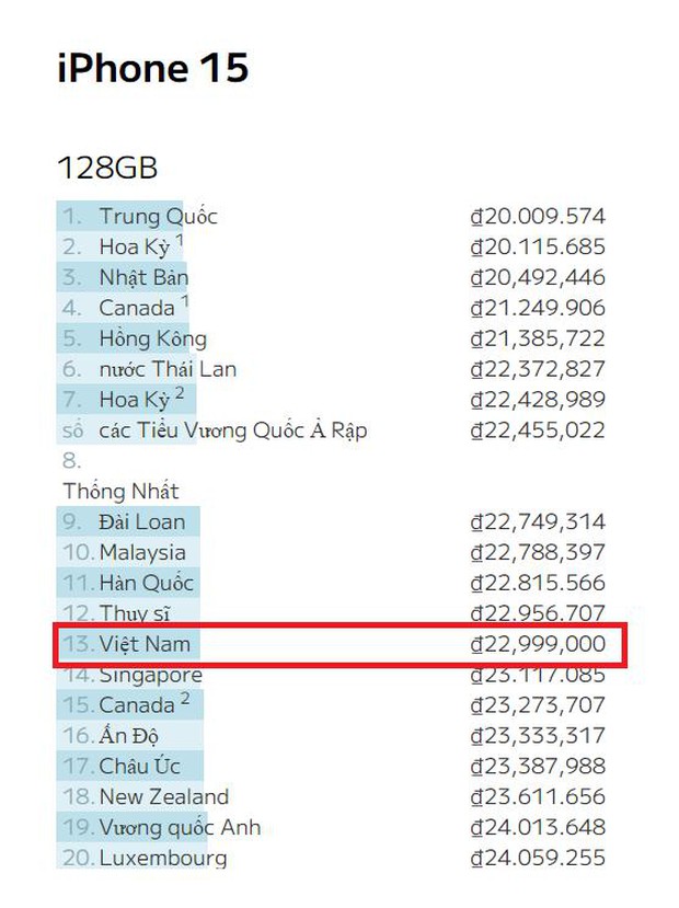 Với iPhone 15 tiêu chuẩn dung lượng 128 GB, giá niêm yết tại thị trường Việt Nam là 22,99 triệu đồng, rẻ thứ 13 thế giới. Đây là con số chỉ thua kém các thị trường lớn nổi tiếng với giá iPhone tốt nhiều năm qua như Trung Quốc, Mỹ, Hong Kong, Nhật Bản... Bên cạnh đó, phiên bản 256GB và 512 GB cũng lần lượt đứng ở vị trí thứ 14 và 15.