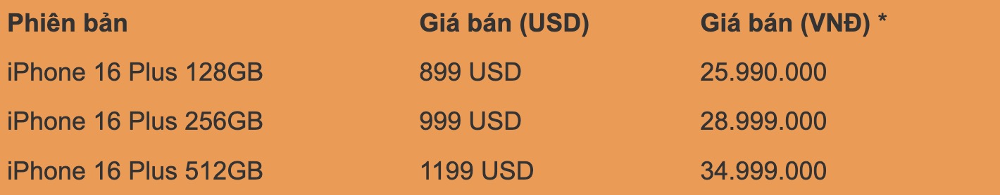 Giá iPhone 16 Plus khởi điểm từ 25.990.000 VND cho bản 128GB đến 34.990.000 VND cho bản 512Gb