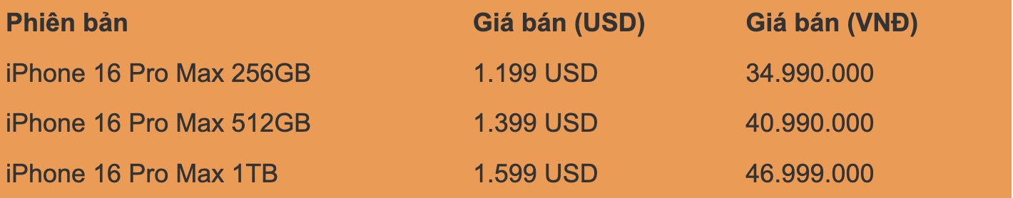 iPhone 16 Pro Max là phiên bản cao cấp nhất đến từ nhà Apple nên mức giá cũng sẽ thuộc dạng “đắt đỏ” nhất.