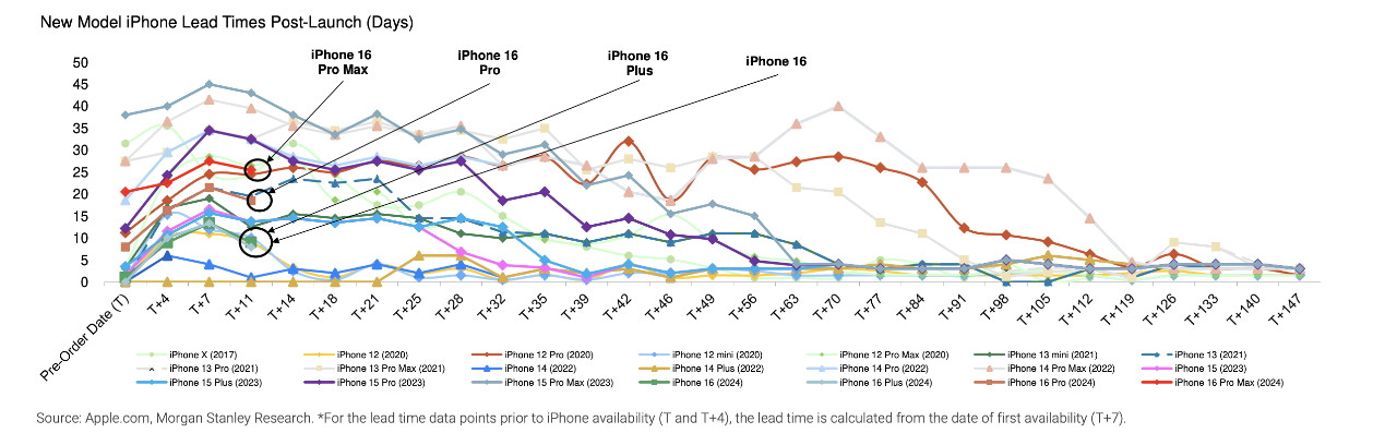 Một khảo sát về thời gian giao hàng của ngân hàng đầu tư Morgan Stanley dẫn đến kết luận rằng lượng đơn đặt hàng iPhone 16 thấp hơn so với các phiên bản tiền nhiệm.