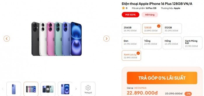 - iPhone 16 Plus - 128GB: 22.890.000 đồng