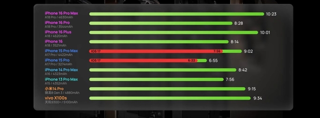 Nếu muốn có thời lượng pin tốt nhất, bạn nên cân nhắc nâng cấp lên iPhone 16 Pro Max. Chiếc điện thoại này đứng đầu bảng kiểm tra với thời lượng pin lên đến 10 giờ 23 phút, nhiều hơn gần một tiếng rưỡi so với iPhone 15 Pro Max chạy iOS 18. iPhone 16 Plus cũng đạt 10 giờ, một thành tích ấn tượng trong ngành. iPhone 16 Pro và iPhone 16 có thời lượng pin khoảng 8,5 giờ, vẫn vượt trội so với các thế hệ trước đó.