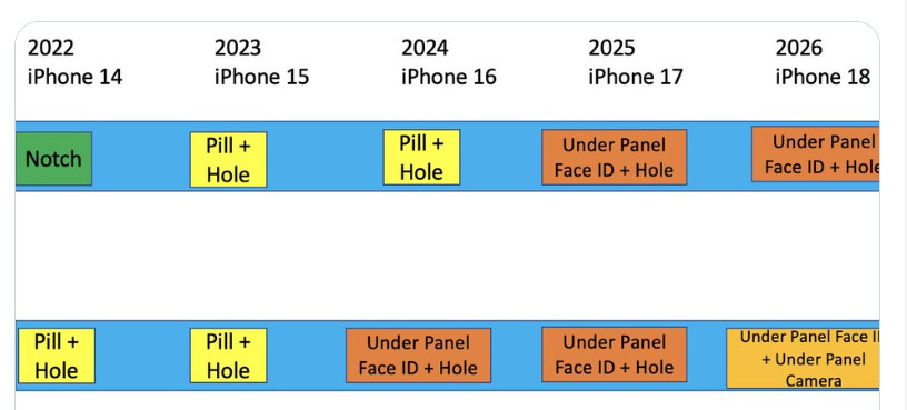 Ông Young đã vạch ra chu kỳ trong đó Apple sẽ luân phiên giữa các mẫu Pro và không phải Pro mỗi năm khi giới thiệu công nghệ liên quan đến phần cắt màn hình hoặc công nghệ ẩn dưới màn hình mới. Theo đó, tất cả các mẫu iPhone 15 sẽ được trang bị Dynamic Island, chứ không riêng gì mẫu "Pro". iPhone 16 Pro và iPhone 16 Pro Max (hoặc Ultra) sẽ được trang bị Face ID dưới màn hình. Đến năm 2026, iPhone 18 Pro sẽ ẩn camera selfie dưới màn hình.