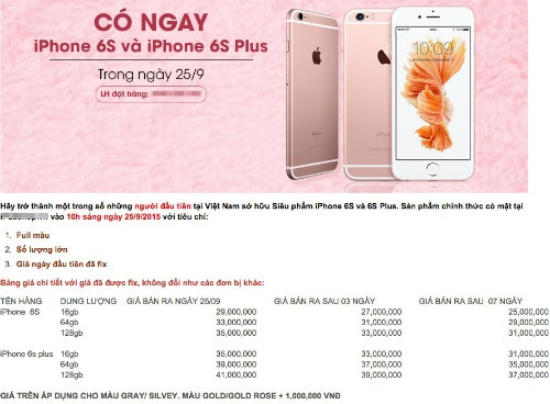 CellphoneS, một hệ thống tại Hà Nội niêm yết giá bán của iPhone 6s sẽ từ 24 triệu đồng (bản 16GB) cho tới 37 triệu đồng (bản 128GB). Còn iPhone 6s Plus có giá từ 28 cho tới 38 triệu đồng cho bản 16 và 64GB. Trong đó, riêng các mẫu màu vàng hồng đều đắt hơn màu trắng và xám tới 7 triệu đồng.