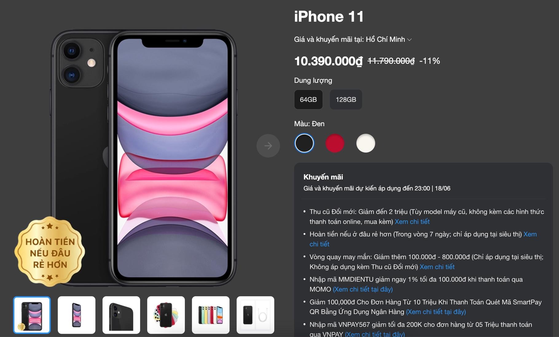 Hiện nay trên thị trường, mẫu iPhone 11 64 GB hiện có giá 9,99 triệu đồng tại một số chuỗi bán lẻ ủy quyền của Apple (AAR) ở Việt Nam. Cụ thể, mức giá này đang được ghi nhận tại 2 AAR là Minh Tuấn Mobile và Hoàng Hà Mobile.