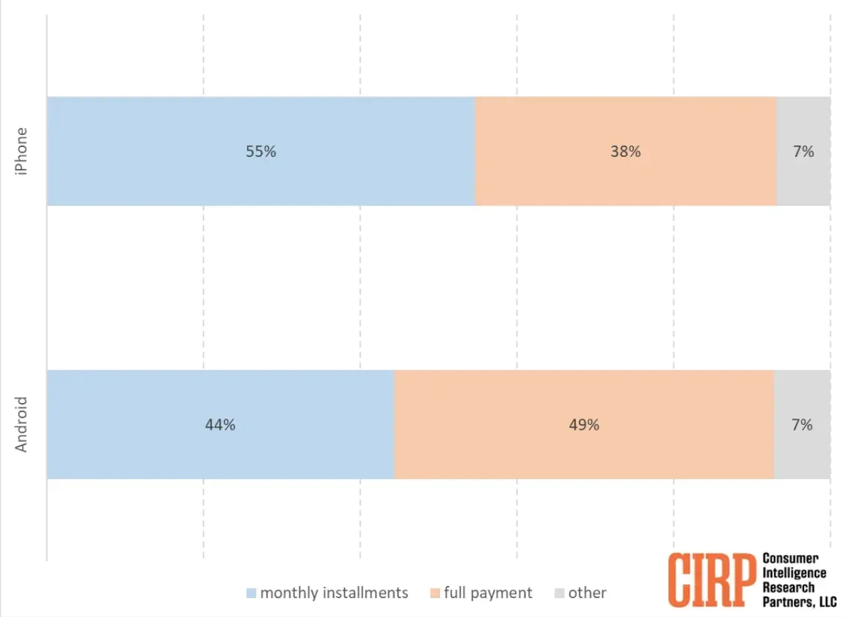 Nhìn chung, tỷ lệ người mua trả góp đều cao ở cả iPhone và điện thoại Android. Các nhà cung cấp dịch vụ biết điều đó và ngày càng đưa ra các lựa chọn tốt cho các gói trả góp, bao gồm các khoản chiết khấu lớn khi đổi điện thoại mới. Ngoài ra, Apple cũng có tùy chọn trả góp hàng tháng cho người dùng Apple Card.