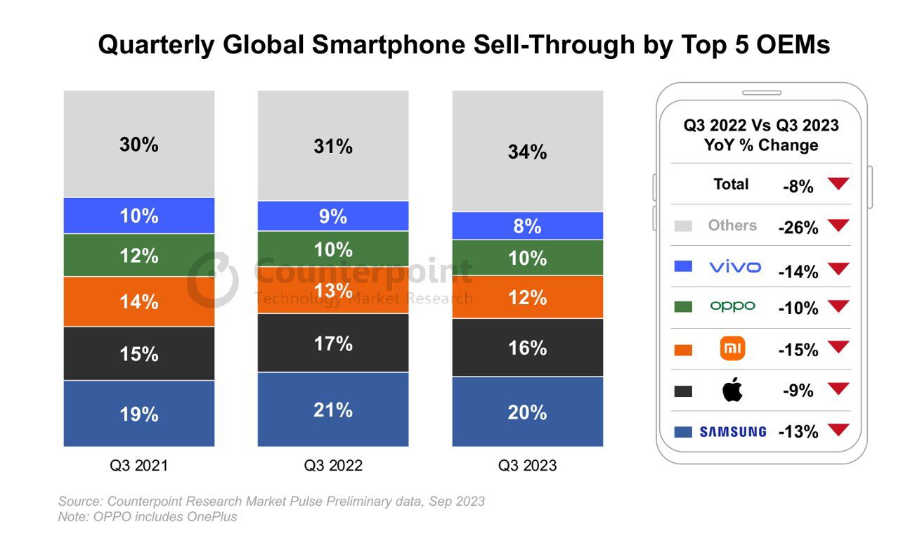 Về những thay đổi trong doanh số, so với cùng kỳ năm ngoái, Apple giảm 9% trong quý 3. Ngược lại, Samsung giảm 13%, Xiaomi giảm 15%, Oppo giảm 10%, Vivo giảm 14% và các nhà cung cấp "khác" giảm 26%.