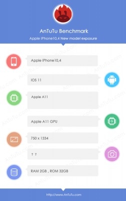 Bên cạnh đó, iPhone 7s cũng đã lộ điểm benchmark trên AnTuTu. Chiếc máy có mã là iPhone 10,4 cho thấy thiết bị này sẽ chạy iOS 11 và sử dụng vi xử lý A11. Về phần màn hình, nó cũng có kích cỡ tương đương như iPhone 7 với 4.7 inch và độ phân giải 750x1334px. Dung lượng RAM cũng là 2GB, tương đương như phiên bản trước đó.