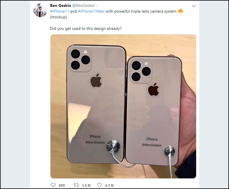 Cách đây vài ngày, Geskin đã công khai đăng tải một bức ảnh về mẫu iPhone XI do chính mình tự làm ra, phỏng theo các thông tin mình thu thập được. Một phần khẳng định đây chính là thiết kế cuối cùng của iPhone XI, anh cũng muốn cho cư dân mạng và fan hâm mộ biết trước để "làm quen" với hình ảnh này.