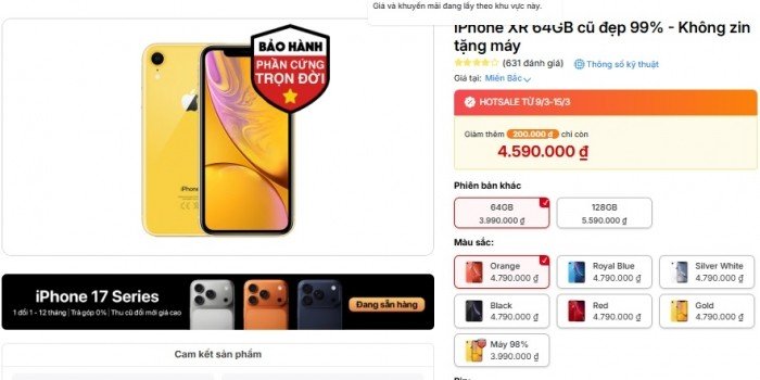 Ở phân khúc iPhone cũ giá rẻ tại Việt Nam tính đến tháng 3/2026, ngay cả khi iPhone 17e vừa xuất hiện. Với mức giá chỉ từ 3,4 - 3,9 triệu đồng, iPhone XR cách xa mức giá khởi điểm khoảng 17,9 triệu đồng của iPhone 17e tuy nhiên điều đáng ngạc nhiên là nó vẫn có thể mang lại trải nghiệm iOS cơ bản mượt mà cho các ứng dụng cơ bản.
