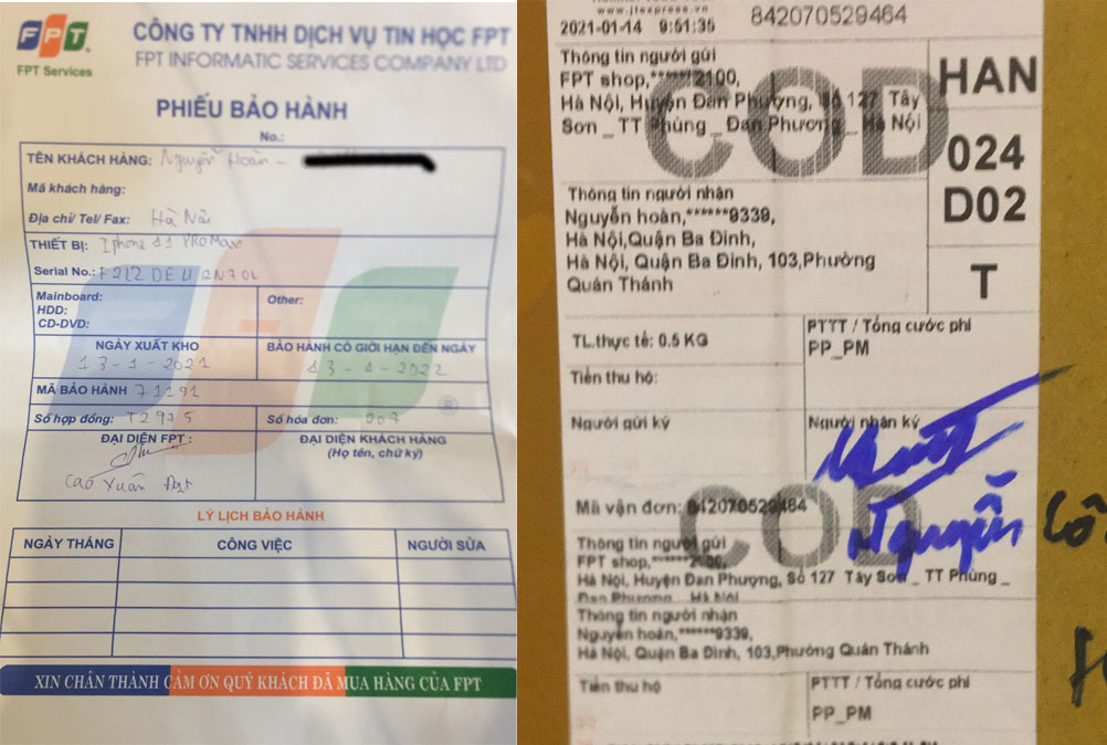 Mấy ngày sau, anh H. nhận được sản phẩm từ đơn vị vận chuyển. Trên gói hàng cho ghi rõ phía gửi là FPT Shop có địa chỉ tại Đan Phượng, Hà Nội. Anh H. cũng khá yên tâm và thanh toán đầy đủ số tiền. Sản phẩm còn đi kèm giấy bảo hành có in thông tin của FPT.