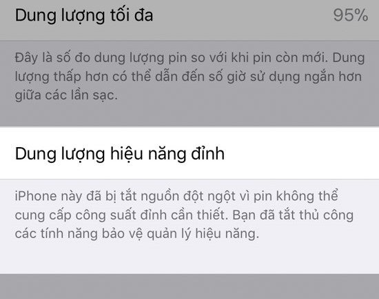 Dù vậy, người dùng cần lưu ý rằng iPhone chỉ bị giảm hiệu năng khi iOS phát hiện thấy pin của người dùng đã bị xuống cấp rõ rệt. Để kiểm tra, người dùng có thể vào Cài đặt > Pin > Tình trạng pin và để ý dòng "Dung lượng hiệu năng đỉnh". Nếu bạn nhìn thấy dòng chữ "Quản lý hiệu năng đã được áp dụng" hay "Tình trạng pin của bạn đã xuống cấp nghiêm trọng" tức là máy của bạn đang bị ghìm hiệu năng và cũng là lúc bạn nên cân nhắc thay pin hoặc thay máy.