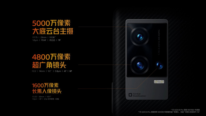iQOO trang bị cho dòng iQOO 8 series của mình hệ thống ba camera chính ở mặt lưng. Phiên bản Pro sẽ có thông số cao cấp với camera góc rộng 50MP sử dụng cảm biến Sony IMX766 từng xuất hiện trên OPPO Find X3 Pro, camera góc siêu rộng 48MP và camera chụp chân dung tele 2X 16MP. Bản tiêu chuẩn thì có camera góc rộng 48MP Sony IMX598, camera góc siêu rộng 13MP và camera chụp chân dung 13MP.