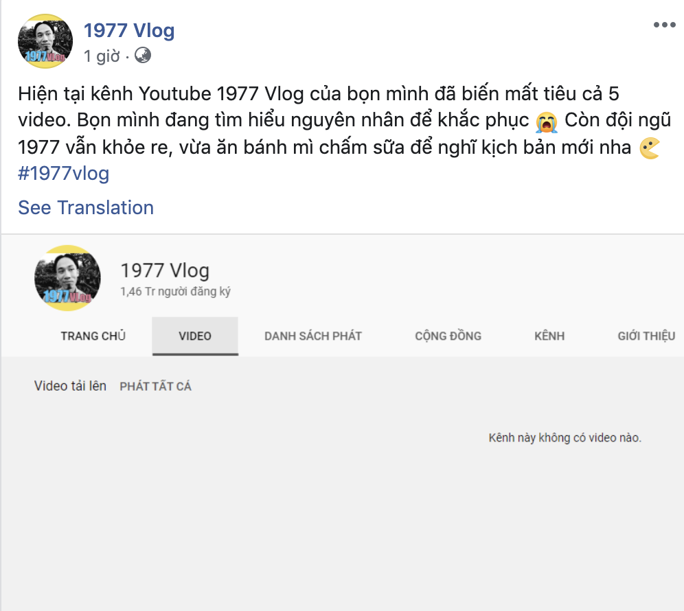 Sáng ngày 3/12, người dùng Youtube tỏ ra khá bất ngờ khi truy cập vào kênh 1977 Vlog mà không thấy bất kì video nào. Khi tìm kiếm kênh này trên Youtube, kết quả trả về vẫn thể hiện tổng lượt theo dõi 1,46 triệu của kênh và thông tin 5 video.