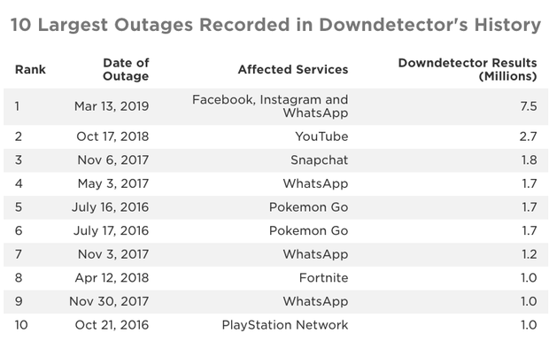 Câu trả lời chính xác là KHÔNG. Đây không phải là lần Facebook lỗi lâu nhất trong lịch sử, theo ghi nhận Facebook và Instagaram đã bị lỗi lâu nhất lên tới 14h đồng hồ vào ngày 13/3/2019. Đó cũng chính là sự cố ngừng hoạt động lớn nhất từ trước tới nay của một mạng xã hội và hút 7,5 triệu lượt báo cáo, vượt xa sự cố ngừng hoạt động lớn thứ hai trên toàn cầu mà YouTube đã trải qua vào tháng 10/2018 với số báo cáo sự cố lên tới 2,7 triệu lượt.