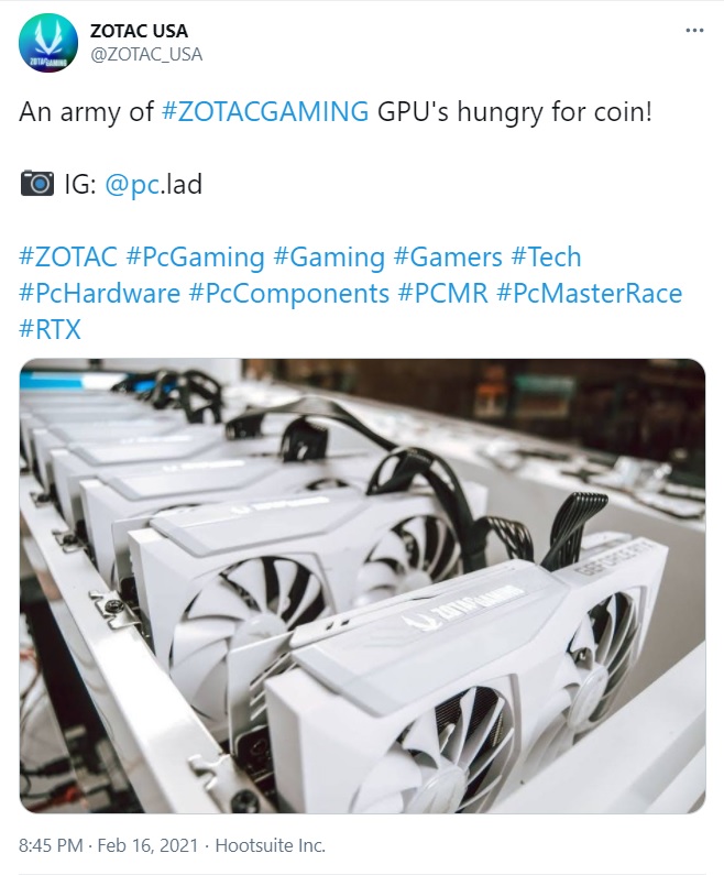 Và để gamer thêm phần "sôi máu", ZOTAC còn bổ sung thêm một vài hashtag chẳng liên quan như "#PcGaming", "#Gaming", "#Gamers", "#PcMasterRace"... mặc cho việc những chiếc GPU trên có lẽ sẽ không bao giờ được sử dụng để chơi game.