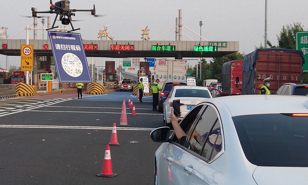 Tại lối ra của một đường cao tốc ở Diêm Thành, phía bắc tỉnh Giang Tô, một chiếc drone gắn một tấm bảng ghi mã QR treo bên dưới, chầm chậm bay song song với dòng ô tô đang nối đuôi nhau di chuyển. Chiếc loa gắn bên dưới chiếc drone liên tục phát ra âm thanh yêu cầu những người lái xe vào thành phố phải quét mã QR để có thể nhanh chóng vượt qua chốt kiểm tra kiểm dịch.