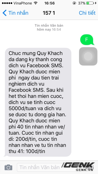 Bước 4: Gửi tin nhắn theo hướng dẫn. Đầu số 1571 thông báo người dùng đã đăng ký thành công dịch vụ Facebook SMS. Trong ngày đầu tiên sử dụng, người dùng được trải nghiệm miễn phí. Hết thời hạn 1 ngày, người dùng sẽ phải trả phí thuê bao 5.000 đồng / tuần. Mỗi status đăng tải qua SMS có giá 200 đồng.