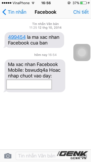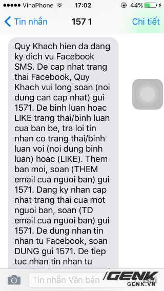 Bước 8: Đăng tải nội dung status từ SMS. Bạn cần nhắn chính xác nội dung cần đăng tải vào đầu số 1571 (dành cho nhà mạng Vinaphone). Ví dụ trong trường hợp này, tôi nhắn nội dung "Hello from Genk.vn".