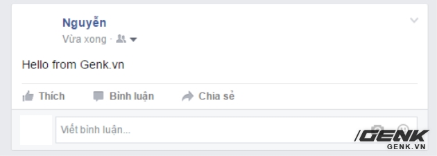 Bước 9: Kiểm tra trên Facebook. Nội dung "Hello from Genk.vn" đã xuất hiện đầy đủ trên Facebook. Vậy là thành công