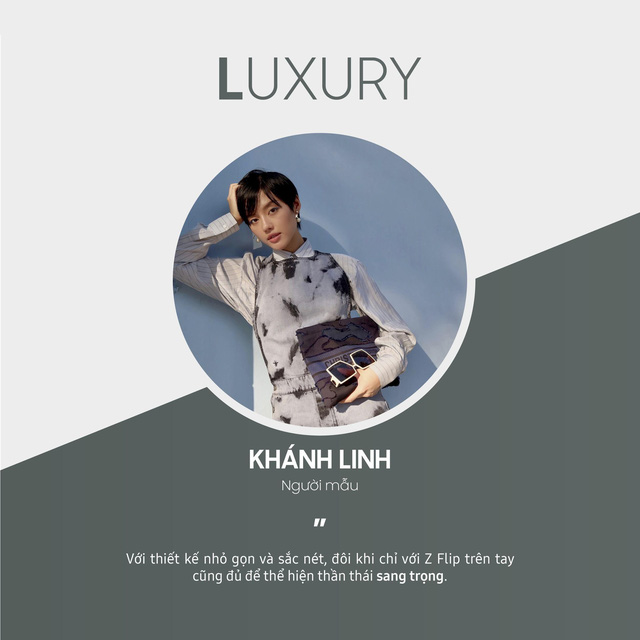 Còn với Khánh Linh, nét sang trọng lịch lãm toát ra từ thiết kế trẻ trung và màu sắc "bắt trend" đã ngay lập tức thu trọn mọi sự chú ý của cô nàng. Cầm Galaxy Z Flip trên tay, Khánh Linh không khỏi tự tin khoe "chỉ cần như vậy thôi là cũng đủ để thể hiện thần thái sang trọng". Điều đó càng cho thấy sự biến hóa đa dạng của những chiếc Galaxy Z Flip, có thể vừa hài hòa đồng thời lại tôn vinh khí chất của người sở hữu.